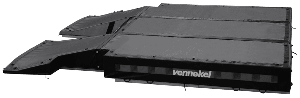 El núcleo de la estera de los módulos base alrededor de la caja de inmersión está fabricado con espuma PUR de alta resistencia, que proporciona estabilidad adicional y resistencia al desgaste en la zona de la caja de inmersión sometida a grandes esfuerzos. La cubierta de la estera está equipada con un tejido de protección de malla extremadamente resistente al desgarro. Los huecos relevantes para la seguridad en la zona de hundimiento están firmemente sellados con cintas de unión para evitar que el pie se tuerza o que la barra se atasque. La línea cero se fija a la colchoneta de salto con pértiga mediante una conexión de velcro y vellón, lo que permite ajustarla de forma rápida y flexible en 20 cm.